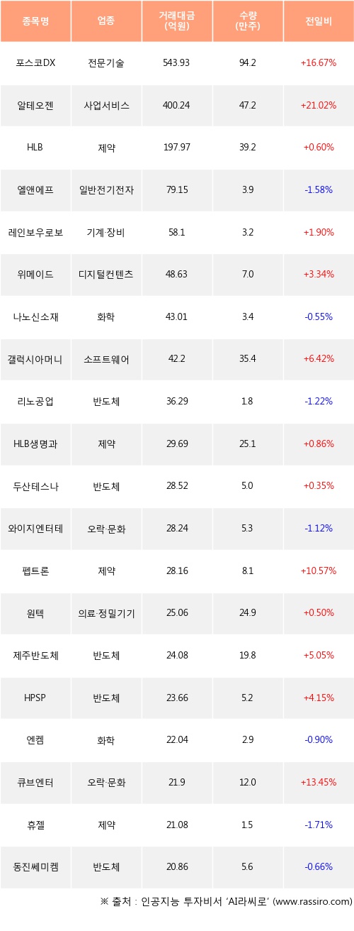 외국인 투자자의 순매수 상위 20개 종목은 포스코DX, 알테오젠, HLB, 엘앤에프, 레인보우로보틱스, 위메이드, 나노신소재, 갤럭시아머니트리, 리노공업, HLB생명과학등이다.