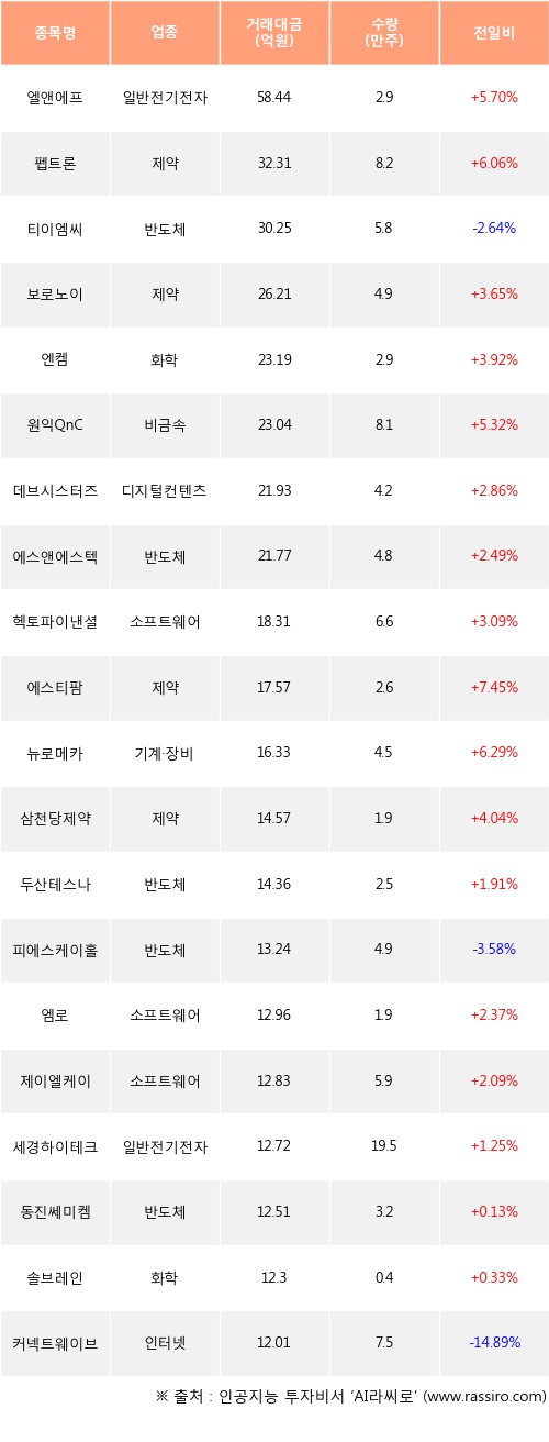 엘앤에프, 펩트론, 보로노이 등은 전일 대비 주가가 상승했고, 티이엠씨, 피에스케이홀딩스, 커넥트웨이브 등은 주가가 하락했다.