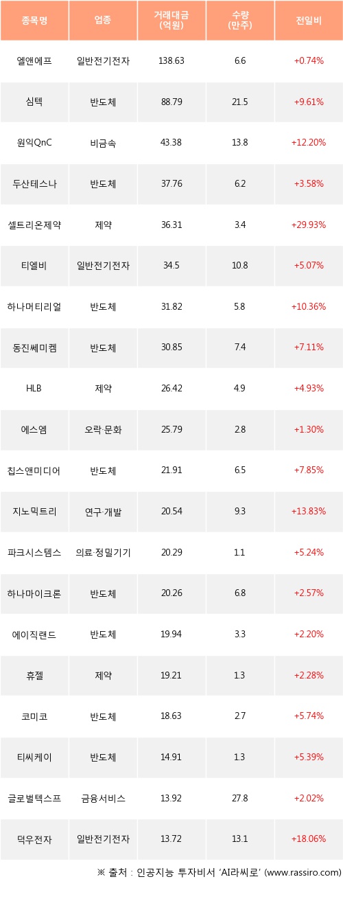기관 투자자의 순매수 상위 20개 종목은 엘앤에프, 심텍, 원익QnC, 두산테스나, 셀트리온제약, 티엘비, 하나머티리얼즈, 동진쎄미켐, HLB, 에스엠등이다.