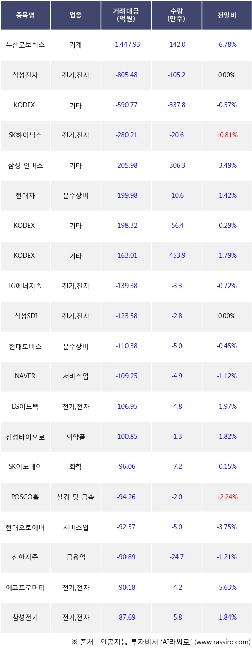 기관 투자자의 순매도 상위 20개 종목은 두산로보틱스, 삼성전자, KODEX 레버리지, SK하이닉스, 삼성 인버스 2X 코스닥150 선물 ETN, 현대차, KODEX 200, KODEX 코스닥150선물인버스, LG에너지솔루션, 삼성SDI등이다.