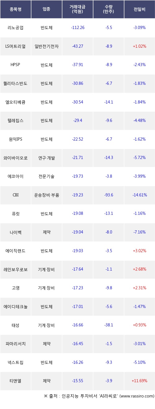 외국인 투자자의 순매도 상위 20개 종목은 리노공업, LS머트리얼즈, HPSP, 퀄리타스반도체, 엘오티베큠, 텔레칩스, 원익IPS, 와이바이오로직스, 에코아이, CBI등이다.
