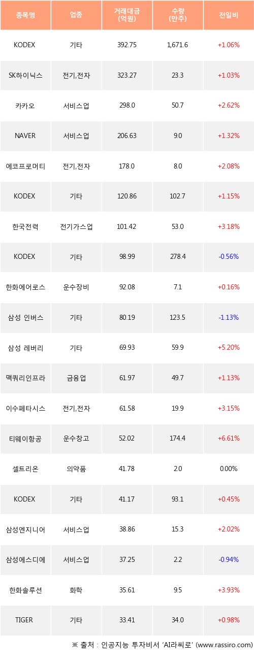 KODEX 200선물인버스2X, SK하이닉스, 카카오 등은 전일 대비 주가가 상승했고, KODEX 코스닥150선물인버스, 삼성 인버스 2X 코스닥150 선물 ETN, 삼성에스디에스 등은 주가가 하락했다.