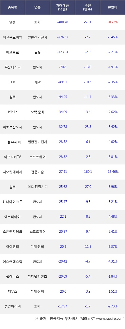 기관 투자자의 순매도 상위 20개 종목은 엔켐, 에코프로비엠, 에코프로, 두산테스나, HLB, 심텍, JYP Ent., 어보브반도체, 더블유씨피, 아프리카TV등이다.