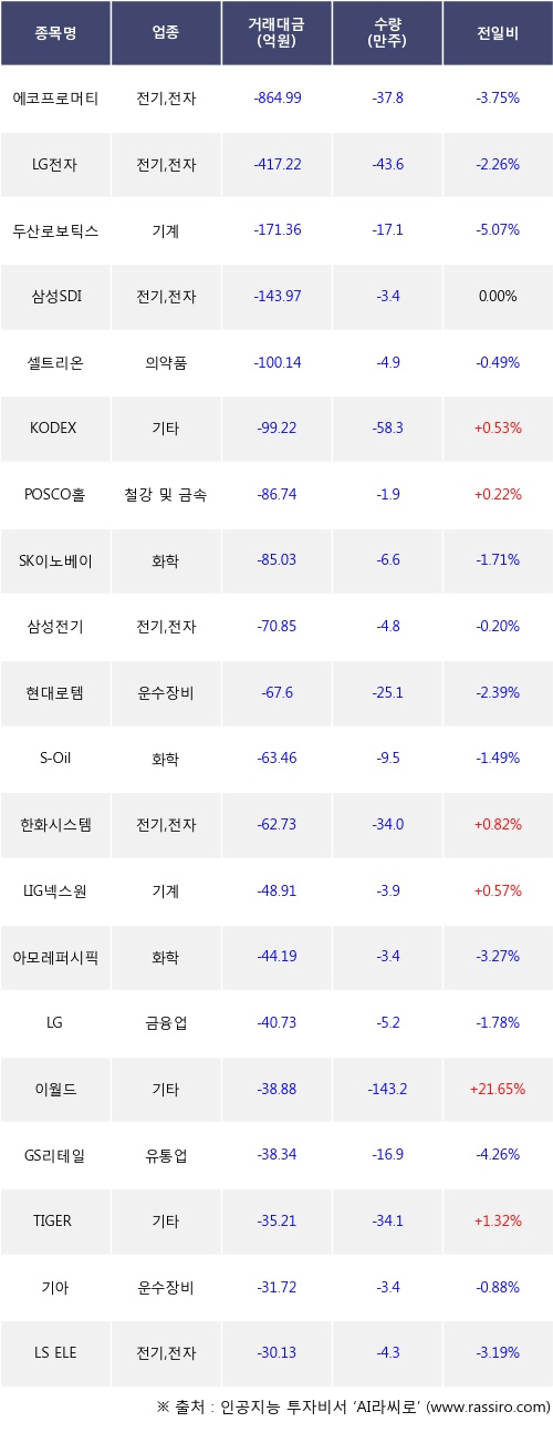 외국인 투자자의 순매도 상위 20개 종목은 에코프로머티, LG전자, 두산로보틱스, 삼성SDI, 셀트리온, KODEX 레버리지, POSCO홀딩스, SK이노베이션, 삼성전기, 현대로템등이다.