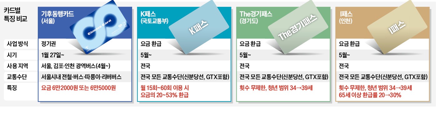 박상우 국토교통부 장관, 오세훈 서울시장, 김동연 경기지사, 유정복 인천시장은 22일 서울 세종대로 한국프레스센터에서 합동 기자설명회를 열어 4개 카드를 소개하고 앞으로 통합을 추진해야 한다는 공감대를 확인했다. 하지만 당분간 교통할인카드의 춘추전국시대가 불가피하다. 각 소비자의 상황에 따라 어떤 카드를 고르는 게 가장 유리할지 따져봤다.