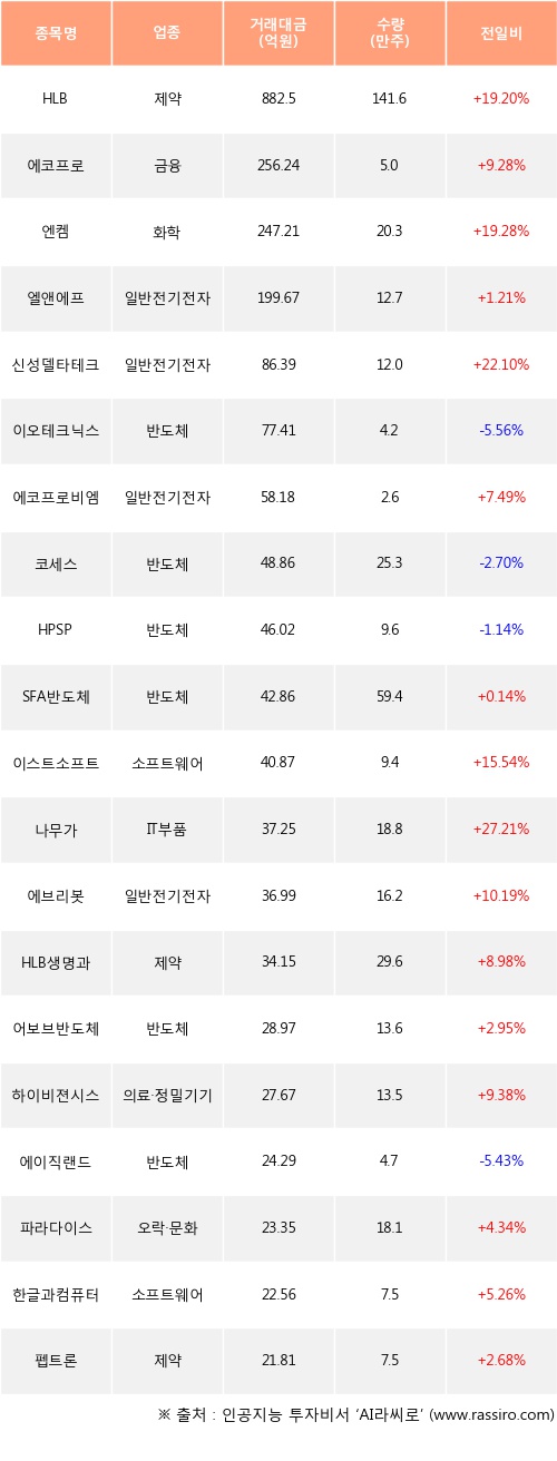 외국인 투자자의 순매수 상위 20개 종목은 HLB, 에코프로, 엔켐, 엘앤에프, 신성델타테크, 이오테크닉스, 에코프로비엠, 코세스, HPSP, SFA반도체등이다.