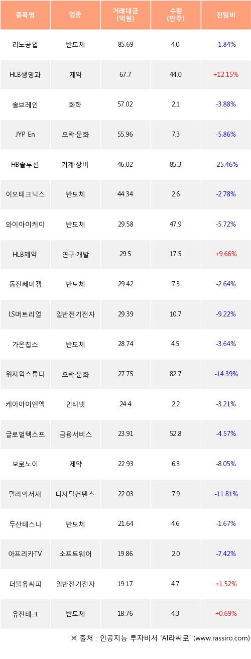 HLB생명과학, HLB제약, 더블유씨피 등은 전일 대비 주가가 상승했고, 리노공업, 솔브레인, JYP Ent. 등은 주가가 하락했다.