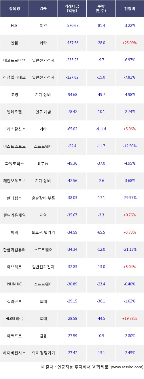 외국인 투자자의 순매도 상위 20개 종목은 HLB, 엔켐, 에코프로비엠, 신성델타테크, 고영, 알테오젠, 크리스탈신소재, 이스트소프트, 파워로직스, 레인보우로보틱스등이다.