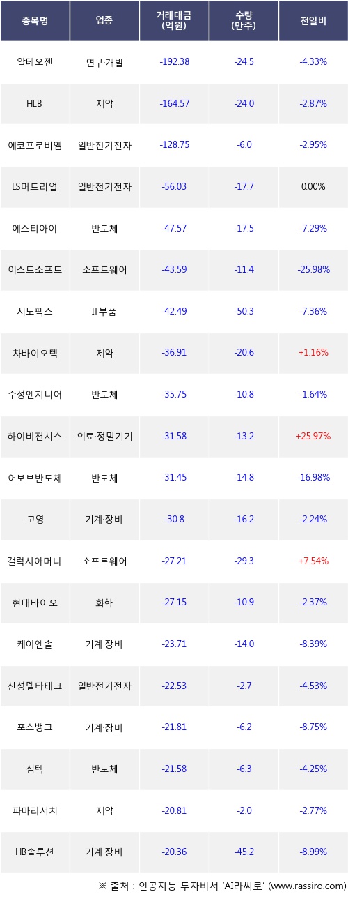 외국인 투자자의 순매도 상위 20개 종목은 알테오젠, HLB, 에코프로비엠, LS머트리얼즈, 에스티아이, 이스트소프트, 시노펙스, 차바이오텍, 주성엔지니어링, 하이비젼시스템등이다.
