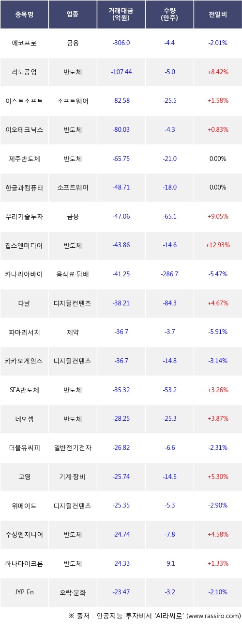 외국인 투자자의 순매도 상위 20개 종목은 에코프로, 리노공업, 이스트소프트, 이오테크닉스, 제주반도체, 한글과컴퓨터, 우리기술투자, 칩스앤미디어, 카나리아바이오, 다날등이다.