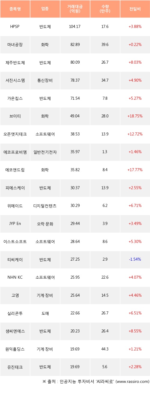 외국인 투자자의 순매수 상위 20개 종목은 HPSP, 마녀공장, 제주반도체, 서진시스템, 가온칩스, 브이티, 오픈엣지테크놀로지, 에코프로비엠, 에코앤드림, 피에스케이등이다.
