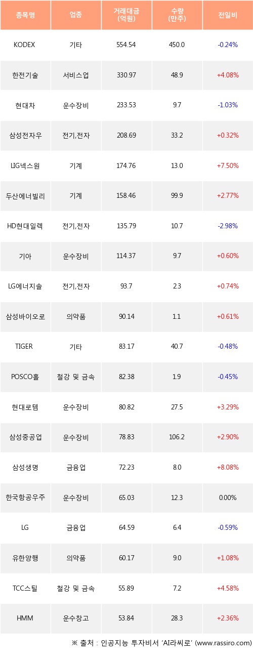 한전기술, 삼성전자우, LIG넥스원 등은 전일 대비 주가가 상승했고, KODEX 200TR, 현대차, HD현대일렉트릭 등은 주가가 하락했다.