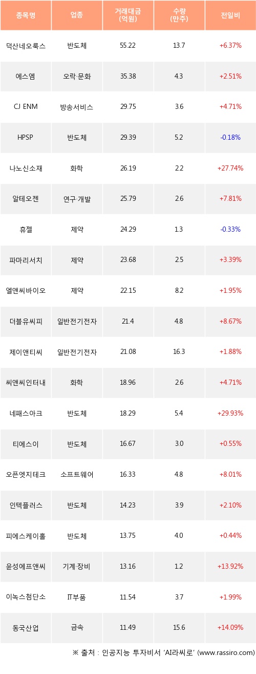 기관 투자자의 순매수 상위 20개 종목은 덕산네오룩스, 에스엠, CJ ENM, HPSP, 나노신소재, 알테오젠, 휴젤, 파마리서치, 엘앤씨바이오, 더블유씨피등이다.