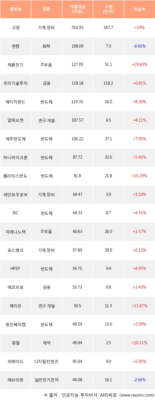 고영, 제룡전기, 우리기술투자 등은 전일 대비 주가가 상승했고, 엔켐, 에브리봇 등은 주가가 하락했다.