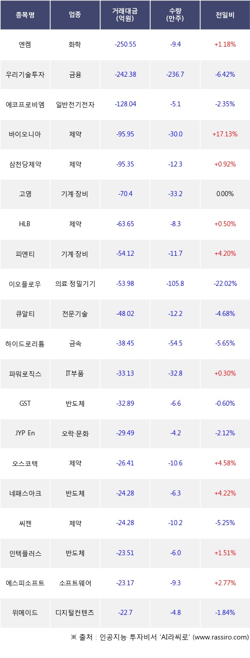 외국인 투자자의 순매도 상위 20개 종목은 엔켐, 우리기술투자, 에코프로비엠, 바이오니아, 삼천당제약, 고영, HLB, 피엔티, 이오플로우, 큐알티등이다.