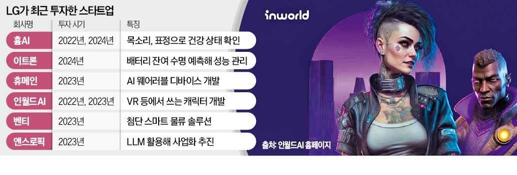 LG의 눈은 정확했다. “AI 시대가 본격 열리면 인월드AI도 스포트라이트를 받을 것”이란 LG의 예상이 맞아떨어지면서 설립 2년밖에 안 된 이 회사의 몸값은 5억달러로 치솟았다. 업계 관계자는 “LG는 스타트업을 통째로 매수하는 다른 대기업과 달리 벤처기업의 기술 개발 과정 등을 지켜보며 투자 규모를 늘리는 방식을 택한다”고 말했다.