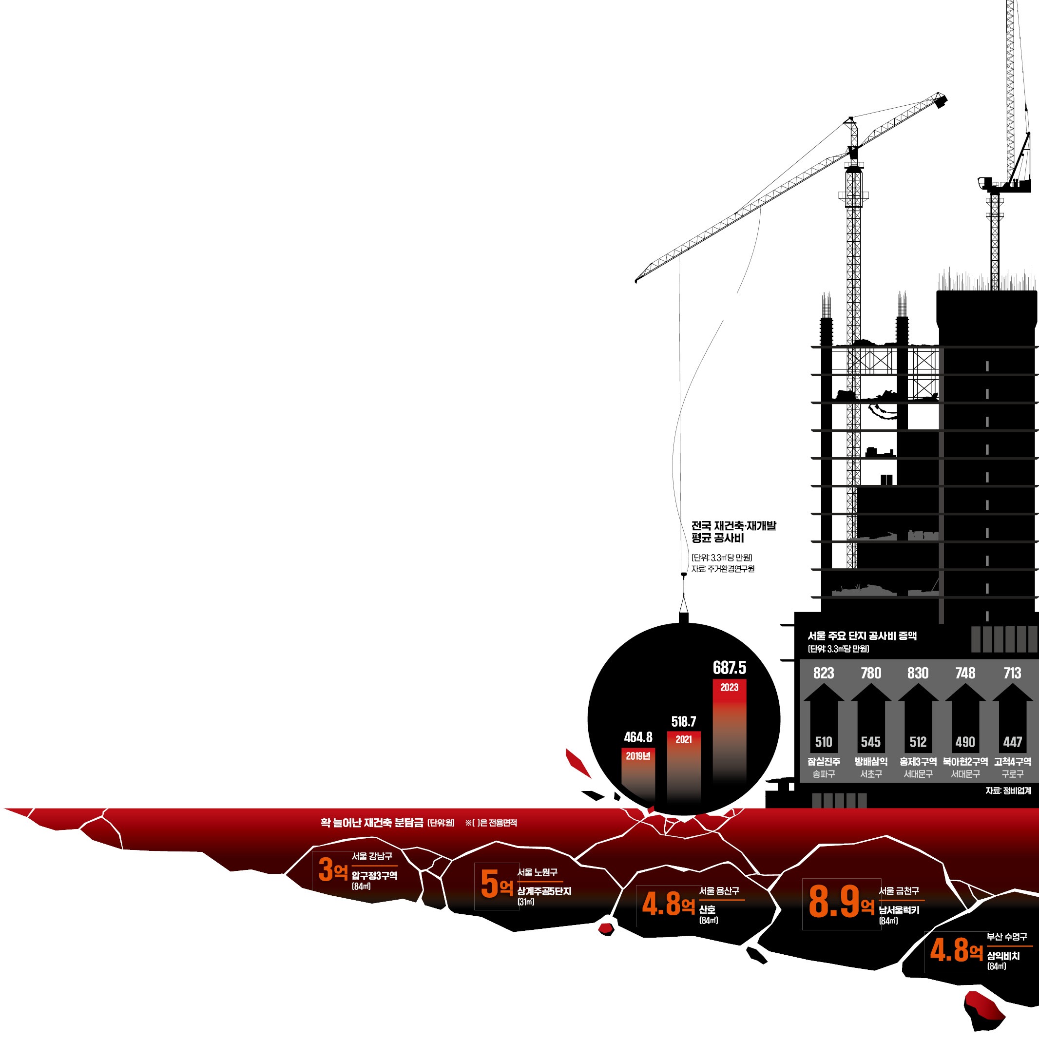 상황이 이렇다 보니 재건축·재개발 사업장은 전쟁터가 따로 없다. 공사비를 올려 받지 못하면 손실을 보는 시공사와 가구당 수억원의 추가 분담금을 내야 하는 조합원 간 갈등이 첨예해지고 있다. 공사비 마찰로 인한 공사 중단과 법정 공방 등으로 아파트 공급 일정도 줄줄이 밀리고 있다.
