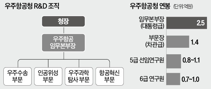 우주항공청 임기제공무원은 특별법에 따라 민간기업 수준 이상의 보수를 받는다. 1급 본부장의 연봉은 대통령과 맞먹는 연 2억5000만원 선이다. 부문장은 차관급 보수인 연 1억4000만원, 5급 선임연구원은 연 8000만~1억1000만원 수준을 기준으로 삼았다. 직무 난이도와 전 직장 연봉 수준을 고려해 필요하다고 인정하면 그 이상도 지급할 수 있다.