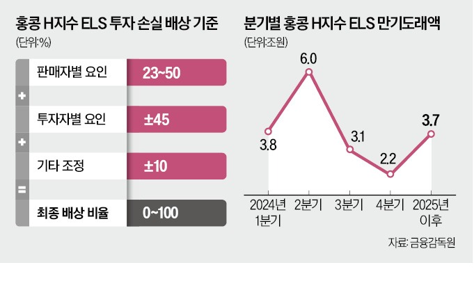 우리은행은 자체 시뮬레이션 결과 평균 배상 비율이 35~40% 수준일 것으로 보고 있다. 앞서 금융당국은 은행과 증권사가 2021년 이후 판매한 홍콩 H지수 ELS 투자 손실의 최대 100%까지 배상할 수 있다는 ‘차등 배상’ 기준을 제시한 바 있다.