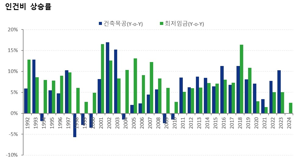인건비 상승 또한 꾸준했다. 1992년 이후 최저임금과 건축목공 노임을 아래 그림에서 비교해 보면, 둘 간의 상관관계가 높은 것을 볼 수 있다. 최저임금이 꾸준히 상승하면서 건설 노임 또한 상승하여 전체적인 공사비 상승을 견인한 것이다. 참고로 1992년 820원이었던 최저임금은 33년이 지난 올해 9,860원으로 무려 1,102% 상승했다. 건설 노임은 지난해까지 449% 인상된 267,639원/일 수준을 보이고 있다.
