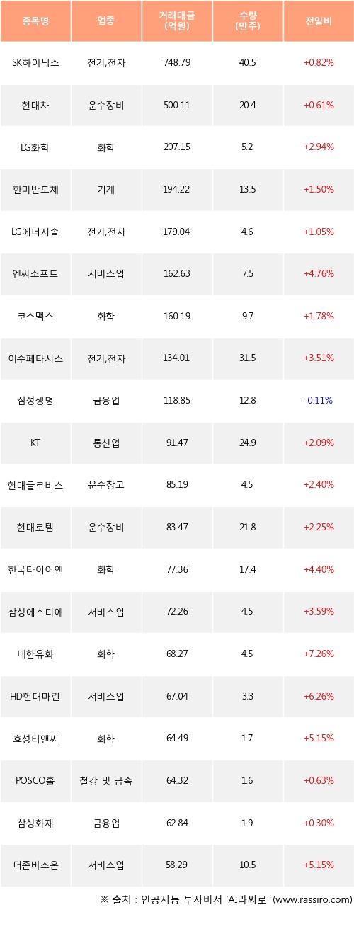 SK하이닉스, 현대차, LG화학 등은 전일 대비 주가가 상승했고, 삼성생명 등은 주가가 하락했다.