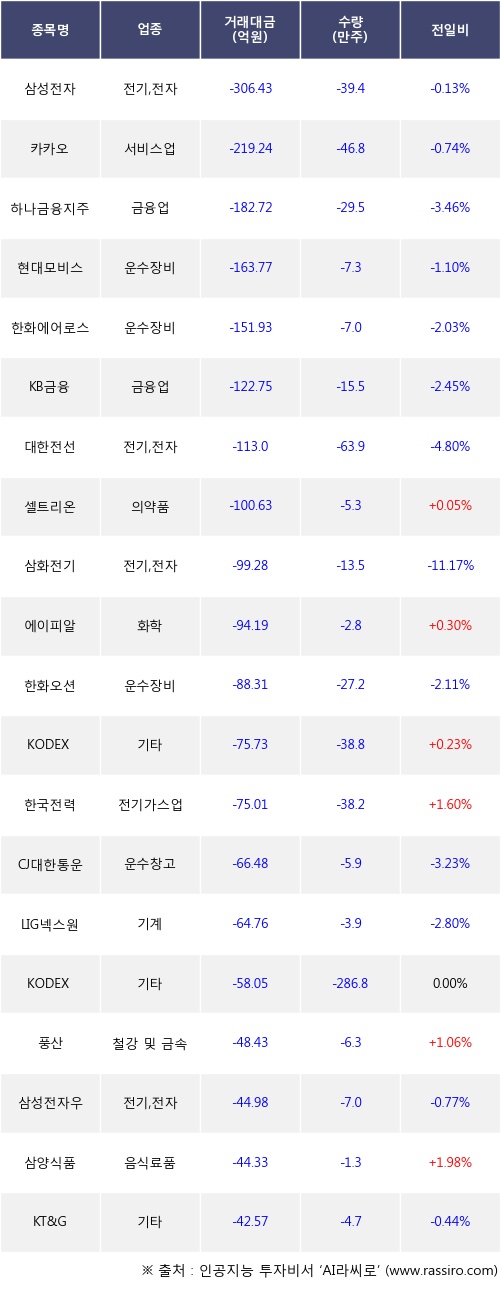 외국인 투자자의 순매도 상위 20개 종목은 삼성전자, 카카오, 하나금융지주, 현대모비스, 한화에어로스페이스, KB금융, 대한전선, 셀트리온, 삼화전기, 에이피알등이다.