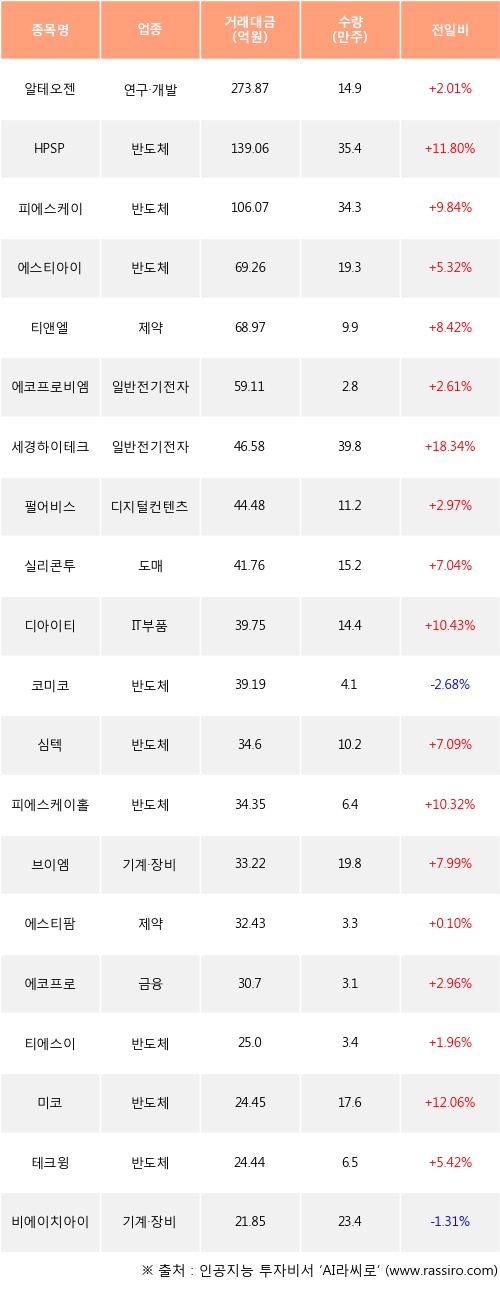 알테오젠, HPSP, 피에스케이 등은 전일 대비 주가가 상승했고, 코미코, 비에이치아이 등은 주가가 하락했다.