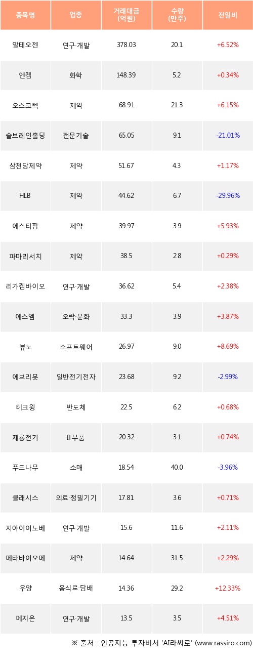 알테오젠, 엔켐, 오스코텍 등은 전일 대비 주가가 상승했고, 솔브레인홀딩스, HLB, 에브리봇 등은 주가가 하락했다.