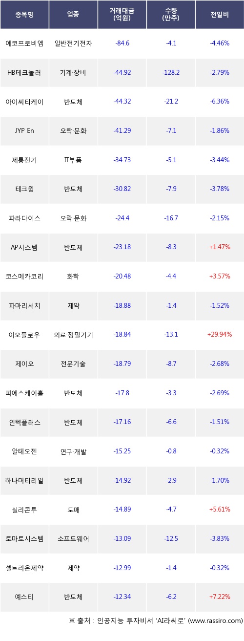 기관 투자자의 순매도 상위 20개 종목은 에코프로비엠, HB테크놀러지, 아이씨티케이, JYP Ent., 제룡전기, 테크윙, 파라다이스, AP시스템, 코스메카코리아, 파마리서치등이다.