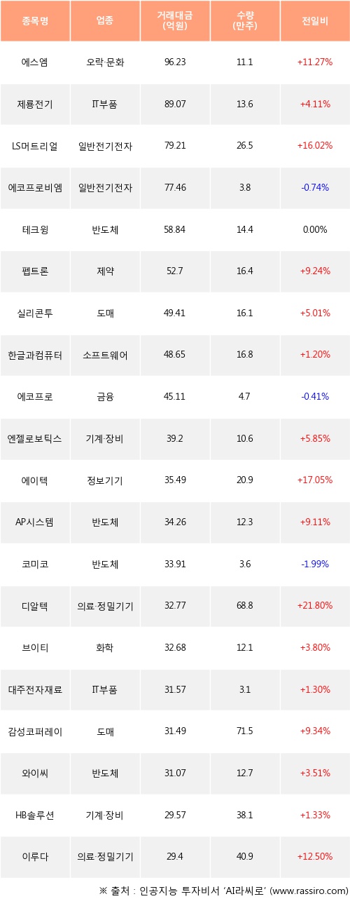 외국인 투자자의 순매수 상위 20개 종목은 에스엠, 제룡전기, LS머트리얼즈, 에코프로비엠, 테크윙, 펩트론, 실리콘투, 한글과컴퓨터, 에코프로, 엔젤로보틱스등이다.