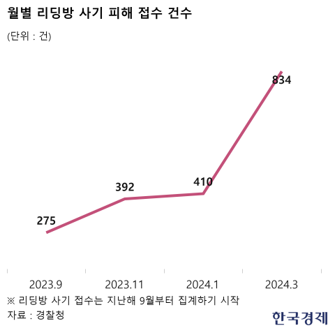 리딩방 사기는 최근 급증하고 있다. 경찰청에 따르면 올해 1분기 접수된 투자리딩방 사기 건수는 1783건으로 지난해 4분기 1452건 대비 22.7% 증가한 것으로 집계됐다. 대부분 유명인, 유명 투자회사 등 전문가를 사칭해서 벌어지는 리딩방 사기로, 집계되지 않은 건수까지 포함하면 실제 피해는 훨씬 더 클 것이라는 관측이다.