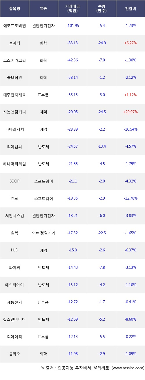 기관 투자자의 순매도 상위 20개 종목은 에코프로비엠, 브이티, 코스메카코리아, 솔브레인, 대주전자재료, 지놈앤컴퍼니, 파마리서치, 티이엠씨, 하나머티리얼즈, SOOP등이다.