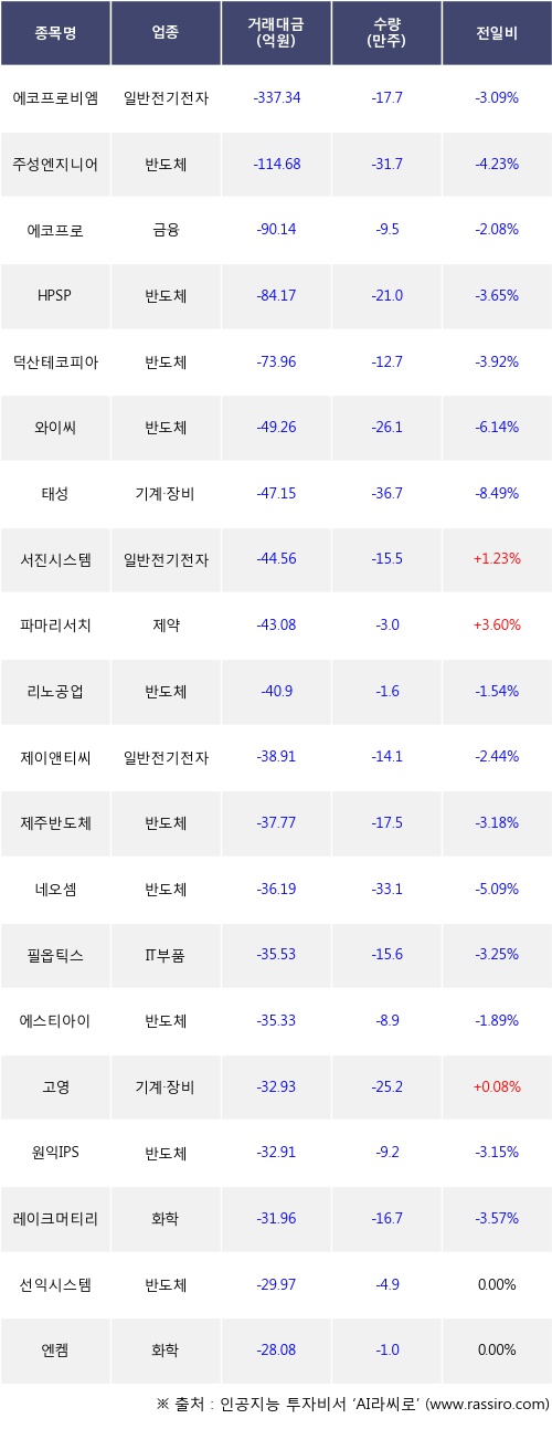 외국인 투자자의 순매도 상위 20개 종목은 에코프로비엠, 주성엔지니어링, 에코프로, HPSP, 덕산테코피아, 와이씨, 태성, 서진시스템, 파마리서치, 리노공업등이다.