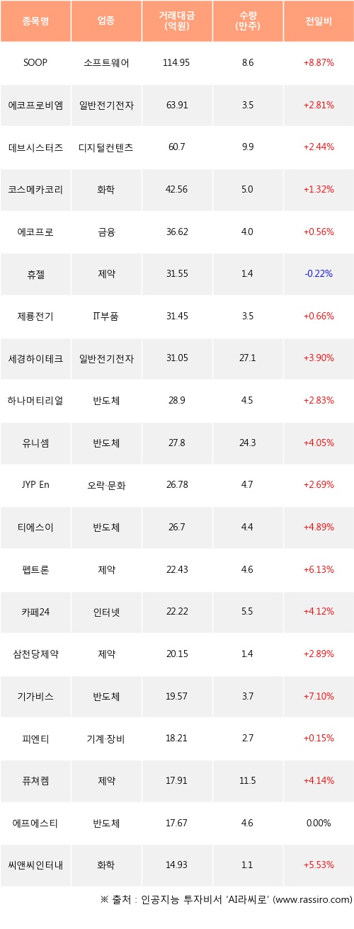 기관 투자자의 순매수 상위 20개 종목은 SOOP, 에코프로비엠, 데브시스터즈, 코스메카코리아, 에코프로, 휴젤, 제룡전기, 세경하이테크, 하나머티리얼즈, 유니셈등이다.