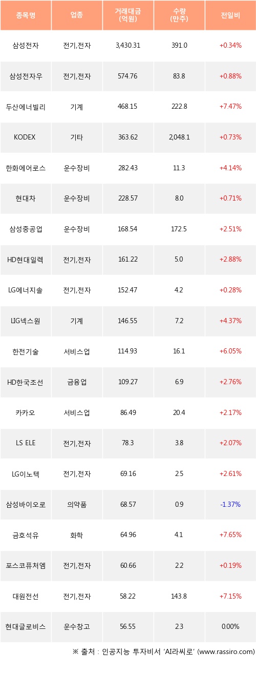 삼성전자, 삼성전자우, 두산에너빌리티 등은 전일 대비 주가가 상승했고, 삼성바이오로직스 등은 주가가 하락했다.