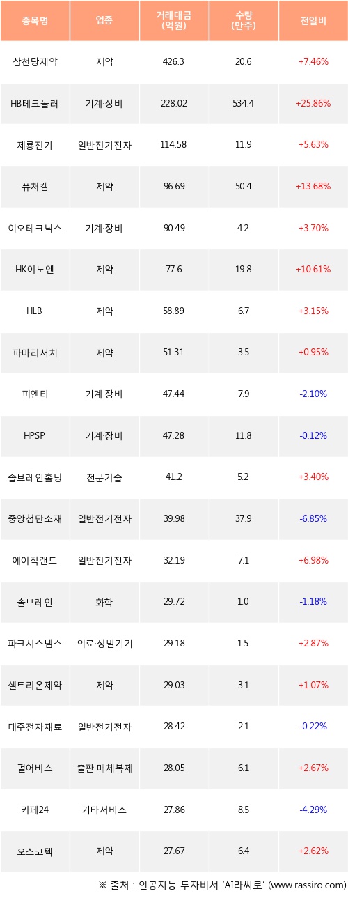 외국인 투자자의 순매수 상위 20개 종목은 삼천당제약, HB테크놀러지, 제룡전기, 퓨쳐켐, 이오테크닉스, HK이노엔, HLB, 파마리서치, 피엔티, HPSP등이다.