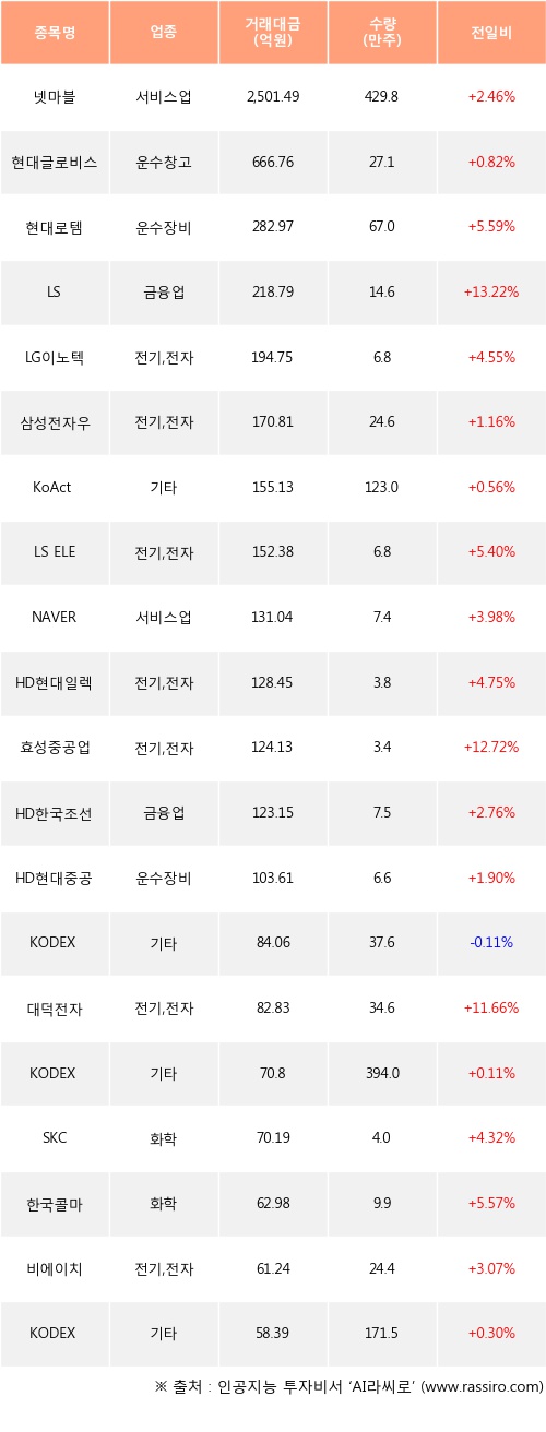 기관 투자자의 순매수 상위 20개 종목은 넷마블, 현대글로비스, 현대로템, LS, LG이노텍, 삼성전자우, KoAct 바이오헬스케어액티브, LS ELECTRIC, NAVER, HD현대일렉트릭등이다.