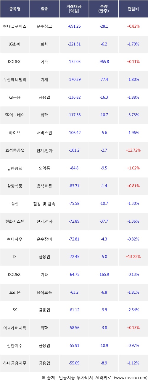 외국인 투자자의 순매도 상위 20개 종목은 현대글로비스, LG화학, KODEX 200선물인버스2X, 두산에너빌리티, KB금융, SK이노베이션, 하이브, 효성중공업, 유한양행, 삼양식품등이다.