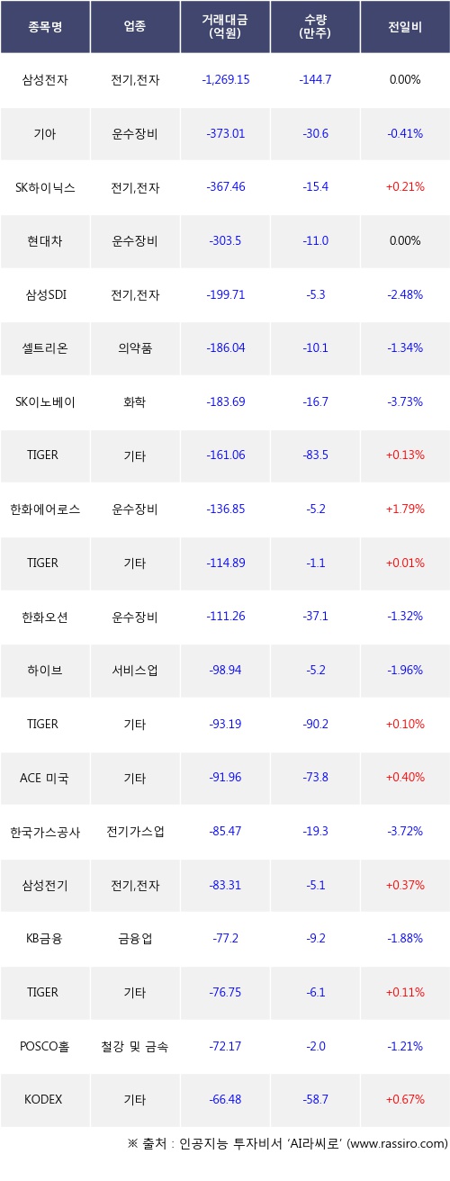 기관 투자자의 순매도 상위 20개 종목은 삼성전자, 기아, SK하이닉스, 현대차, 삼성SDI, 셀트리온, SK이노베이션, TIGER 미국S&P500, 한화에어로스페이스, TIGER CD1년금리액티브(합성)등이다.