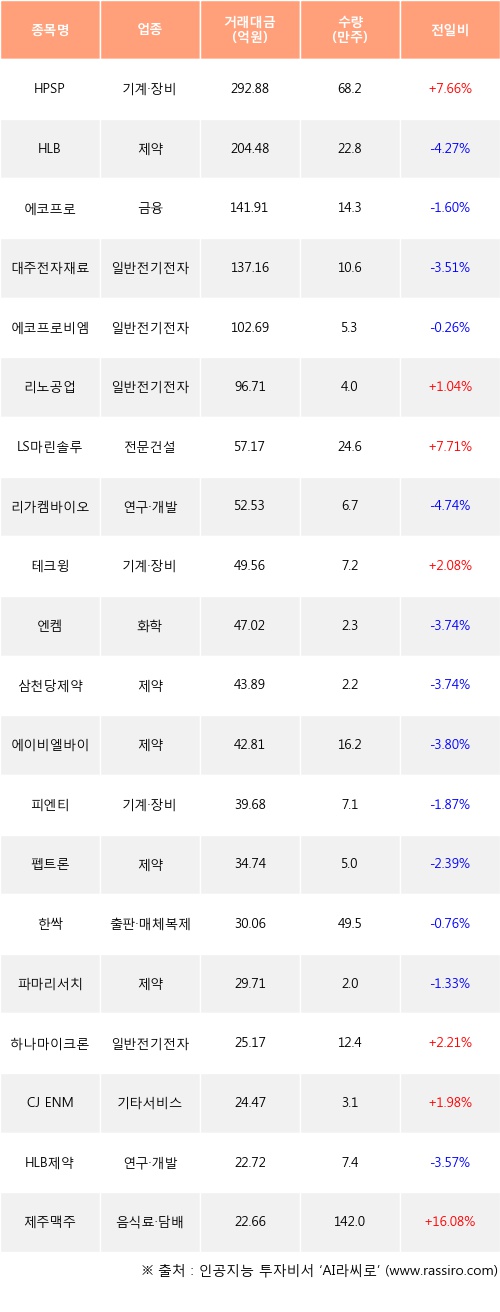 HPSP, 리노공업, LS마린솔루션 등은 전일 대비 주가가 상승했고, HLB, 에코프로, 대주전자재료 등은 주가가 하락했다.