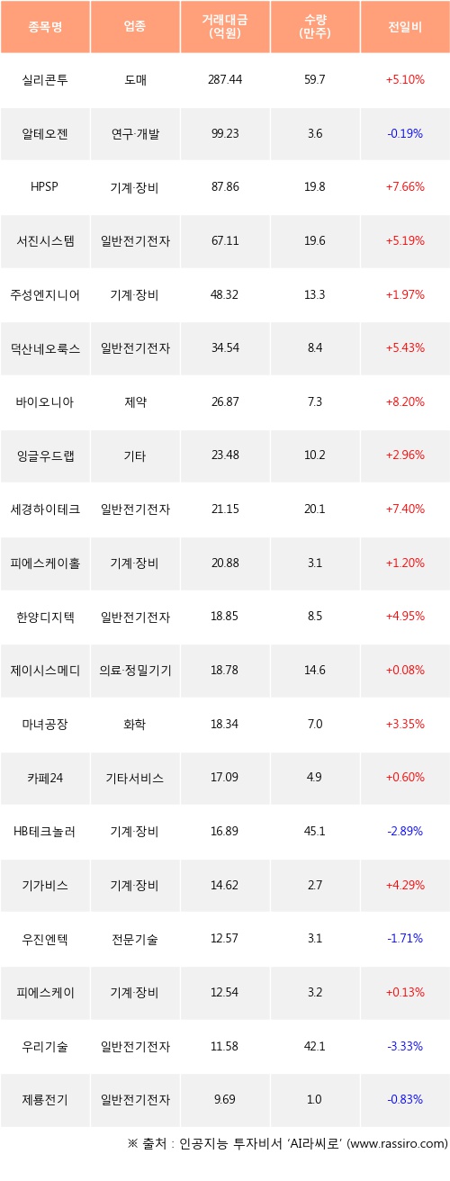 실리콘투, HPSP, 서진시스템 등은 전일 대비 주가가 상승했고, 알테오젠, HB테크놀러지, 우진엔텍 등은 주가가 하락했다.