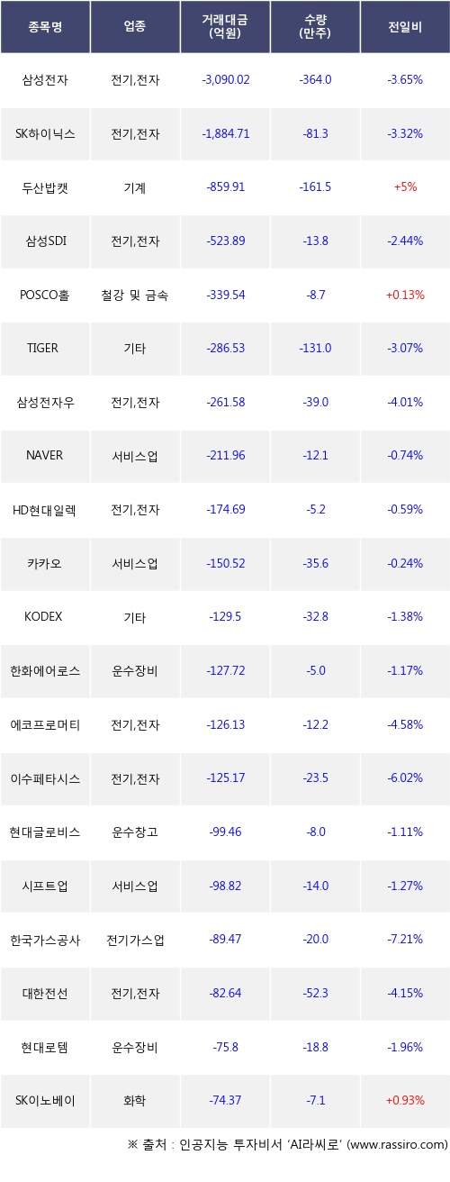 외국인 투자자의 순매도 상위 20개 종목은 삼성전자, SK하이닉스, 두산밥캣, 삼성SDI, POSCO홀딩스, TIGER 미국테크TOP10 INDXX, 삼성전자우, NAVER, HD현대일렉트릭, 카카오등이다.