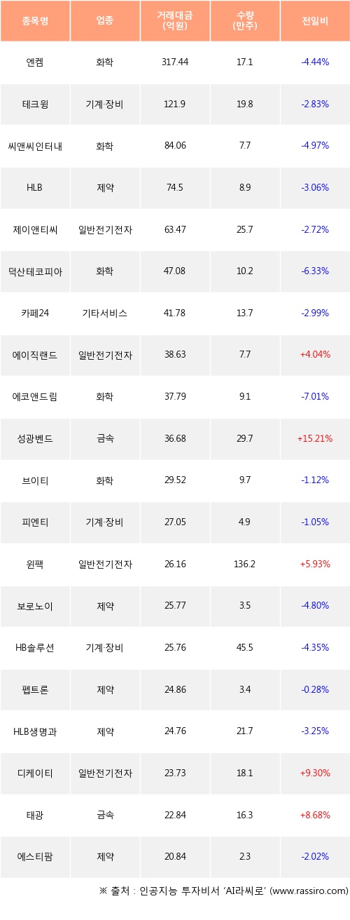 외국인 투자자의 순매수 상위 20개 종목은 엔켐, 테크윙, 씨앤씨인터내셔널, HLB, 제이앤티씨, 덕산테코피아, 카페24, 에이직랜드, 에코앤드림, 성광벤드등이다.