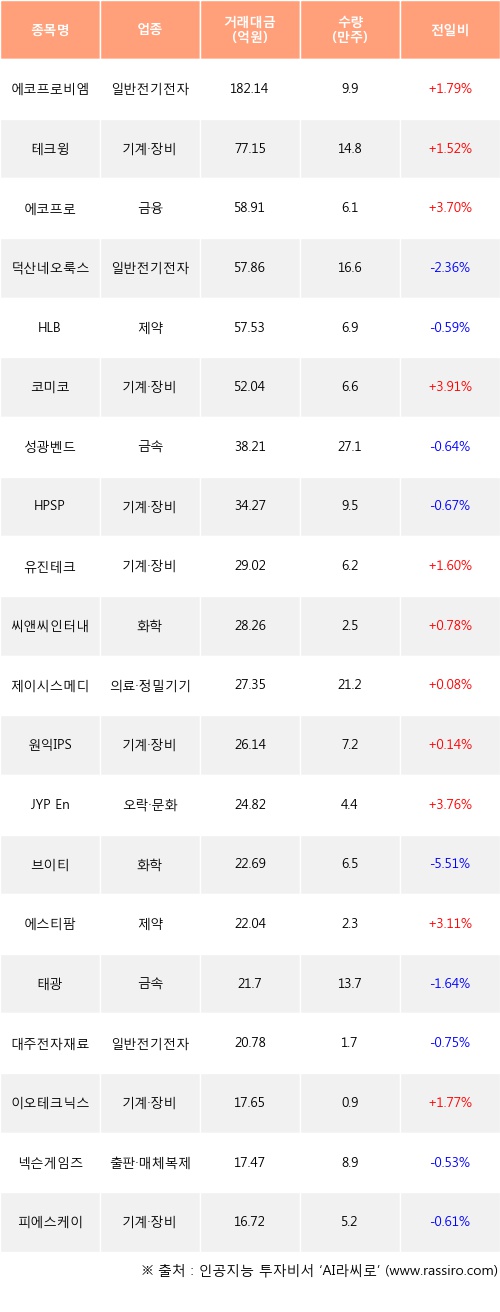 에코프로비엠, 테크윙, 에코프로 등은 전일 대비 주가가 상승했고, 덕산네오룩스, HLB, 성광벤드 등은 주가가 하락했다.