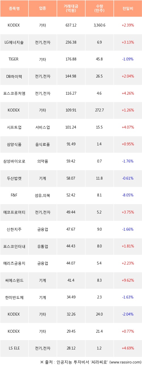 KODEX 200선물인버스2X, LG에너지솔루션, DB하이텍 등은 전일 대비 주가가 상승했고, TIGER 200, 삼성바이오로직스, 두산밥캣 등은 주가가 하락했다.