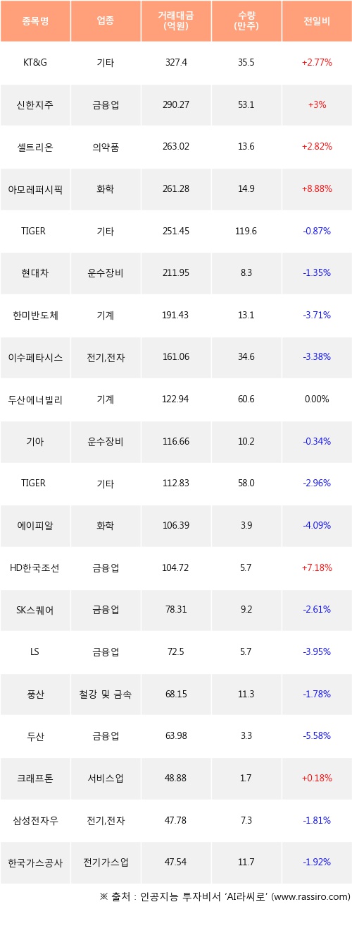 KT&G, 신한지주, 셀트리온 등은 전일 대비 주가가 상승했고, TIGER 미국테크TOP10 INDXX, 현대차, 한미반도체 등은 주가가 하락했다.