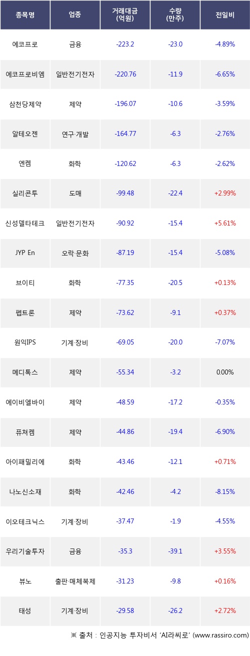 외국인 투자자의 순매도 상위 20개 종목은 에코프로, 에코프로비엠, 삼천당제약, 알테오젠, 엔켐, 실리콘투, 신성델타테크, JYP Ent., 브이티, 펩트론등이다.