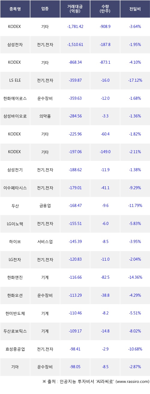 기관 투자자의 순매도 상위 20개 종목은 KODEX 레버리지, 삼성전자, KODEX 코스닥150레버리지, LS ELECTRIC, 한화에어로스페이스, 삼성바이오로직스, KODEX 200, KODEX 코스닥150, 삼성전기, 이수페타시스등이다.
