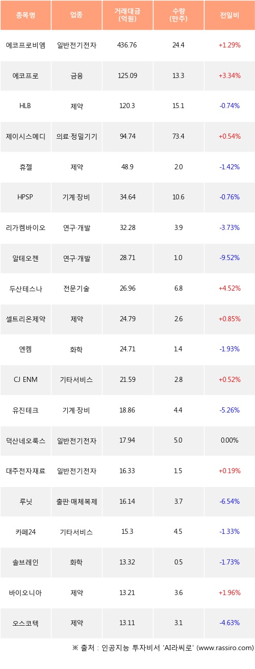 에코프로비엠, 에코프로, 제이시스메디칼 등은 전일 대비 주가가 상승했고, HLB, 휴젤, HPSP 등은 주가가 하락했다.