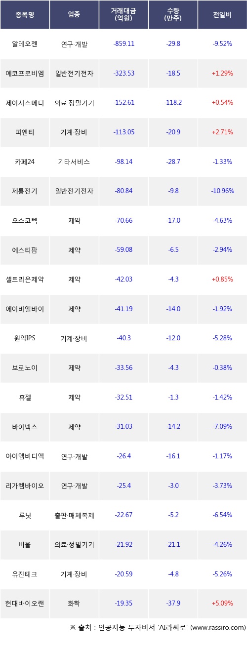 외국인 투자자의 순매도 상위 20개 종목은 알테오젠, 에코프로비엠, 제이시스메디칼, 피엔티, 카페24, 제룡전기, 오스코텍, 에스티팜, 셀트리온제약, 에이비엘바이오등이다.